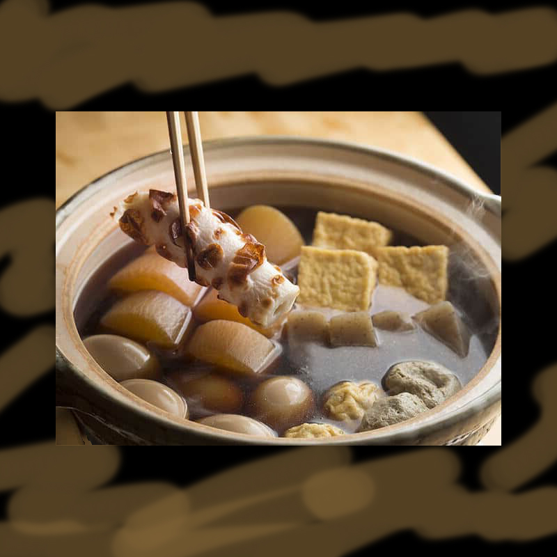 Tra i protagonisti che galleggiano nel brodo scuro troviamo il Daikon, la grande radice di ravanello giapponese che, dopo lunghe ore di cottura, diventa tenera come burro e trasparente. Seguono le uova sode, che assumono una colorazione brunastra e un sapore intenso, e il Konnyaku, una gelatina di radice di igname dalla consistenza gommosa quasi ipnotica. Non mancano mai i prodotti derivati dal pesce, come il Chikuwa (tubicini di pasta di pesce grigliata) e l'Hanpen, una sorta di "nuvola" soffice e bianca fatta di pesce e patate dolci. Ogni morso è accompagnato da un tocco di Karashi, la senape giapponese piccante che pulisce il palato e scalda ulteriormente il corpo.