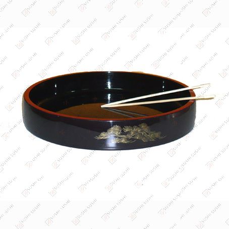Vassoio porta sushi tondo, laccato nero con bordi rossi.